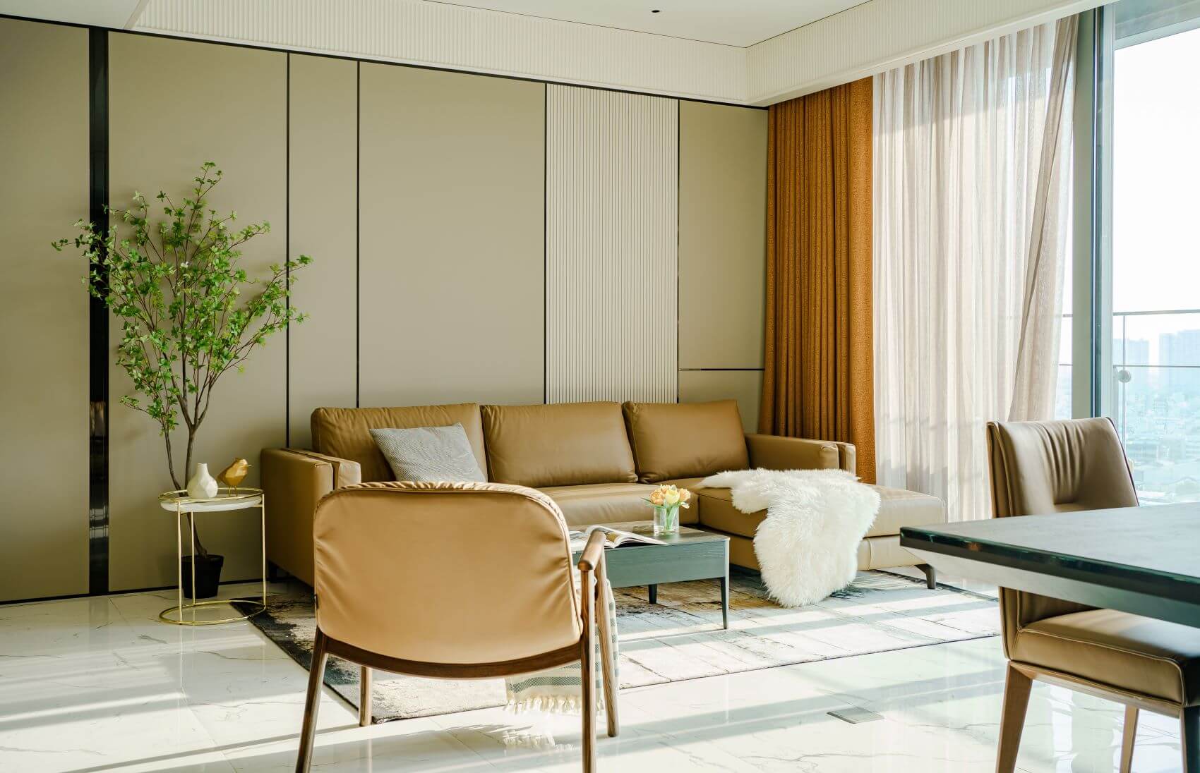 Ấn tượng đầu tiên khi ghé thăm căn hộ rộng rãi này, chính là “view triệu đô” nhìn ra bờ sông Sài Gòn. Gia chủ cũng rất yêu thích và mong muốn giữ trọn vẹn được góc nhìn thoáng đãng cùng ánh sáng tự nhiên cho không gian. Đội ngũ thiết kế đã đưa ra phương án sẽ giữ nguyên các nét đặc trưng, tập trung vào các chi tiết ốp trần tường, tạo ra các điểm nhấn duyên dáng. Bên cạnh đó, sử dụng các sản phẩm nội thất bọc da mang tới màu sắc trầm ấm và sự sang trọng cho không gian.