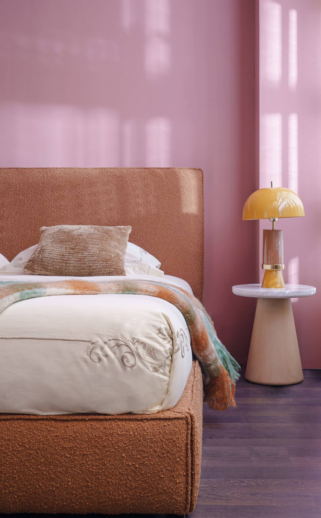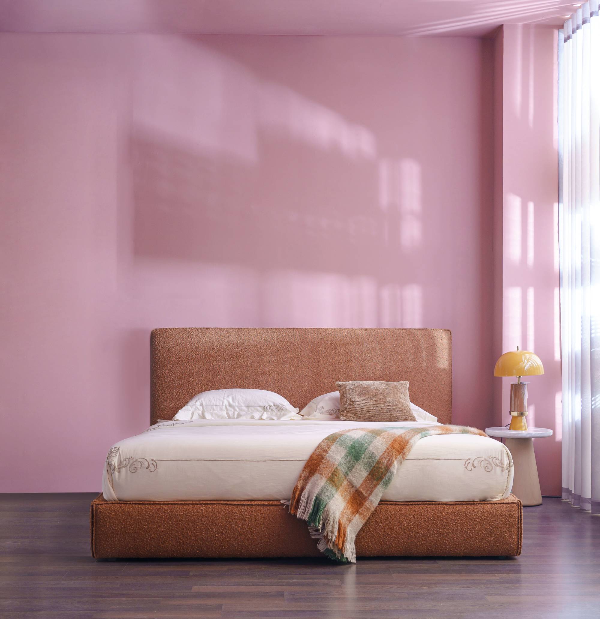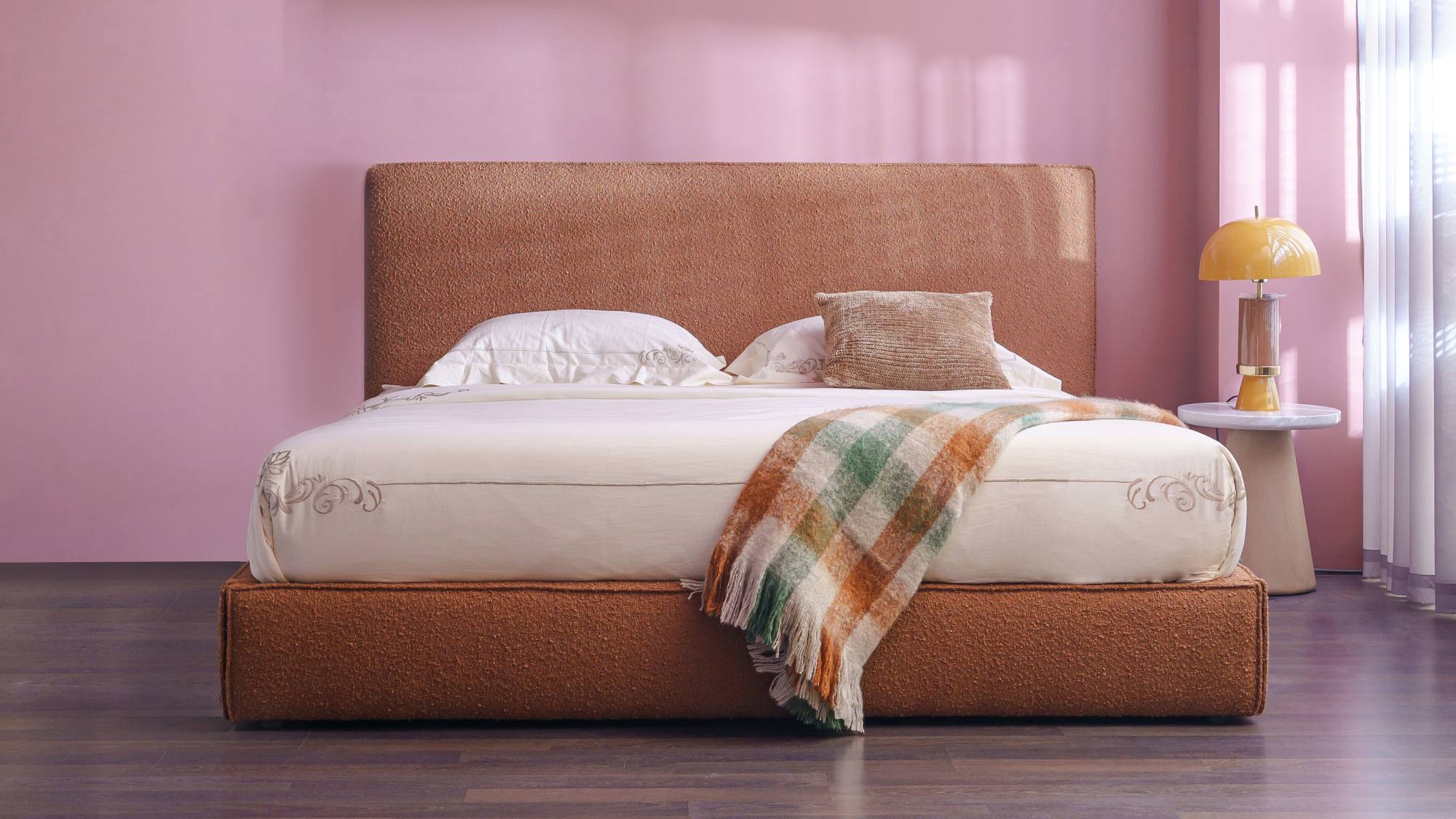 Từ khóa: nội thất, cảm hứng, thiết kế, không gian sống, giường Roche 1m8, Chất liệu và bề mặt, vải Bouclé Rust