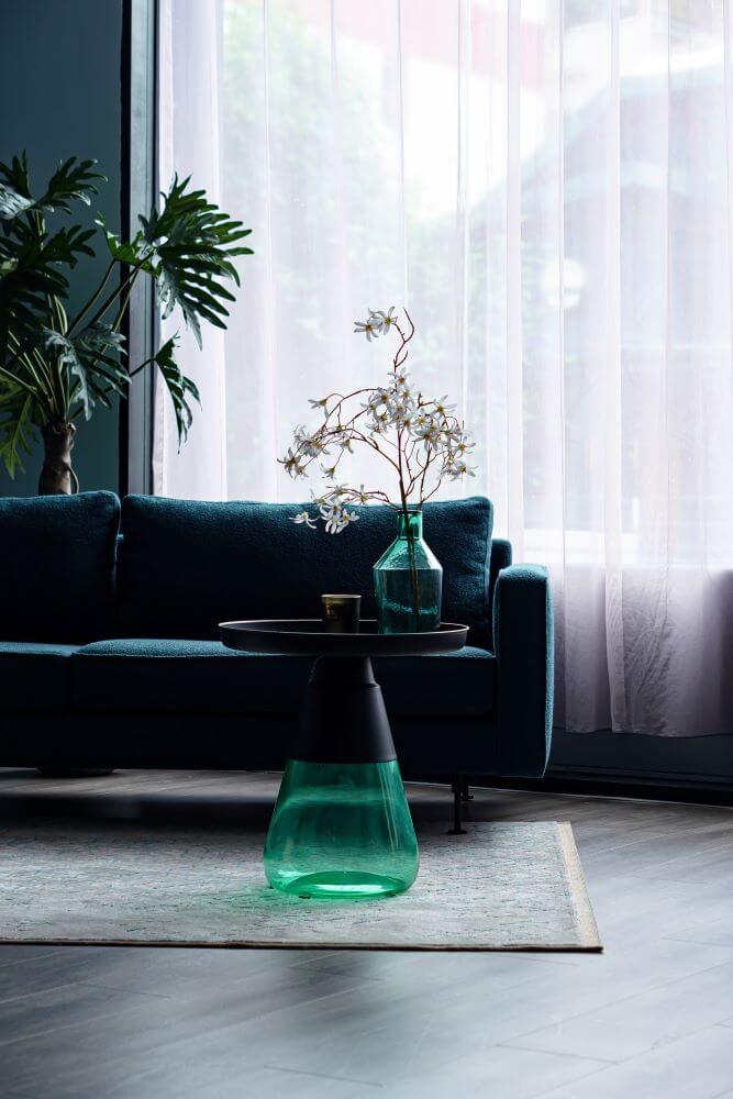 Bàn bên Bottiglia mang dáng vẻ thanh lịch với thiết kế tinh tế, làm tôn lên vẻ đẹp của sắc xanh chủ đạo trong phòng khách. Bạn có thể đặt những cuốn sách yêu thích, tách trà nóng hoặc một bình hoa tươi, điểm xuyết thêm nét sinh động cho không gian. Đèn đứng Lamo Kukui với thiết kế độc đáo và ánh sáng dịu nhẹ, là mảnh ghép hoàn hảo cho phòng khách. Như một dải ánh sáng mộc mạc mà tinh tế, chiếc đèn còn góp phần tạo điểm nhấn phong cách, thể hiện gu thẩm mỹ tao nhã của gia chủ.