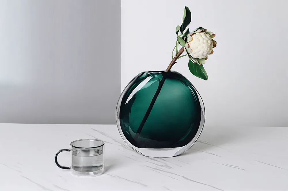 Bình Emerald S Green Glass là phiên bản nhỏ gọn của dòng bình thủy tinh cao cấp Emerald, mang sắc xanh ngọc lục bảo trong và sâu, thủy tinh dày, gần như không bọt khí nên bắt sáng rất đẹp. Dáng tròn thấp, miệng mài nhẵn tạo cảm giác chắc tay và tinh xảo, đủ nổi bật với chỉ một nhành hoa đơn. Khi đặt cùng Emerald L, hai tỷ lệ cao – thấp tạo thành cụm décor sang trọng, hợp với không gian Scandinavian, Contemporary.