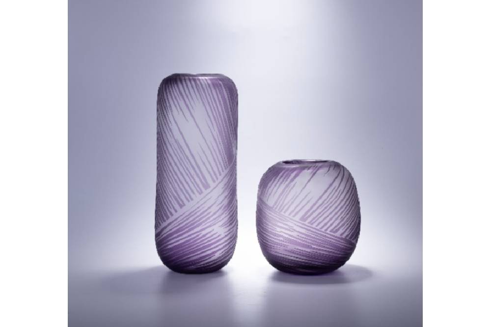 Bình hoa có thiết kế tròn, màu tím nhạt và họa tiết kẻ tinh tế, mang đến vẻ đẹp sang trọng và thanh lịch. Đây là điểm nhấn hoàn hảo cho không gian sống, phù hợp để cắm hoa tươi hoặc trang trí độc lập.