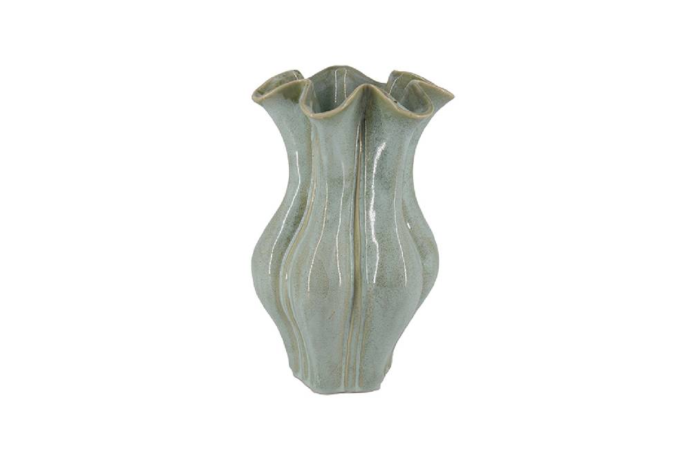 Bình gốm có thiết kế độc đáo với hình dáng uốn lượn mềm mại và hai phần miệng xòe rộng giống như cánh hoa. Màu xanh nhạt với bề mặt bóng mượt tạo cảm giác tươi mới và thanh thoát. Các đường khía dọc tinh tế không chỉ làm nổi bật vẻ đẹp mà còn mang lại cảm giác sinh động. Bình rất thích hợp để trưng bày hoa hoặc làm vật trang trí nghệ thuật trong không gian sống.