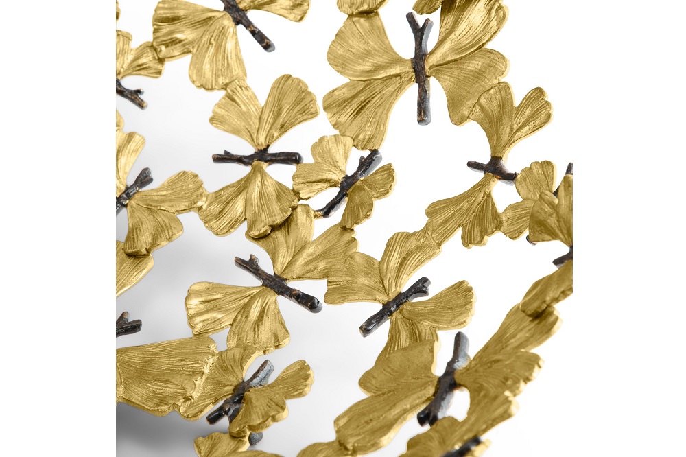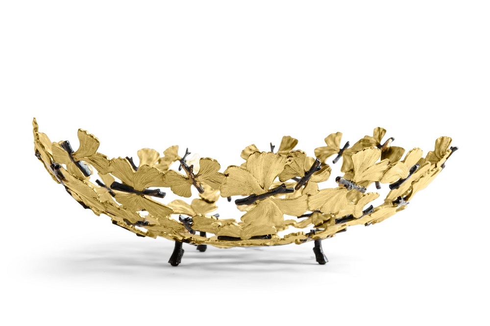 The Butterfly Ginkgo Collection celebrates the representation of flora as fauna. Michael's fascination with a particular type of ginkgo tree , the Ginkgo Biloba, or "Butterfly Ginkgo", which grows with a double leaf reminiscent of a butterfly's wings, gave rise to a fantasia image of the plant. Executed at the highest level of handcraftsmanship, each piece is rendered in solid brass with hand etched cocoon-shaped vessels. The pieces in the collection are a tour de force of the handcrafted process, capturing the poetic spirit that is so deeply indicative of Michael's work.