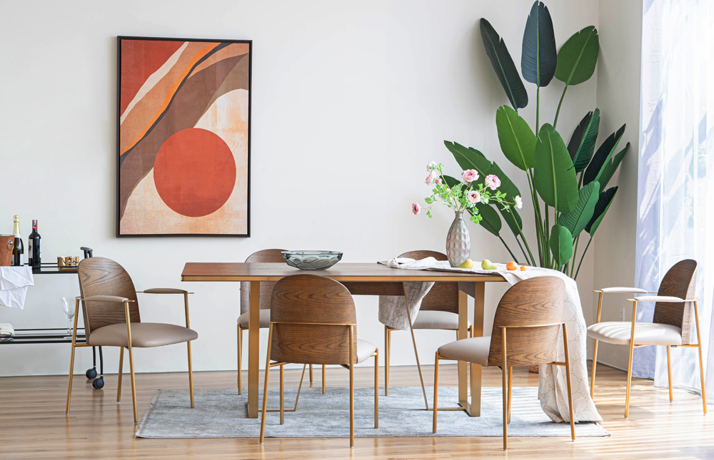 Ghế có tay Porto được phủ lớp Veneer oak cùng với Inox màu gold và lớp nệm bọc da công nghiệp không những đem lại cảm giác êm ái khi ngồi mà còn hòa với tông màu nâu gỗ trầm tối giản nhưng nổi bật những đường vân gỗ tinh tế tô điểm nét hiện đại, trang nhã cho căn phòng ăn ấm cúng.