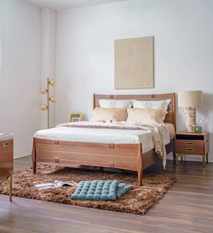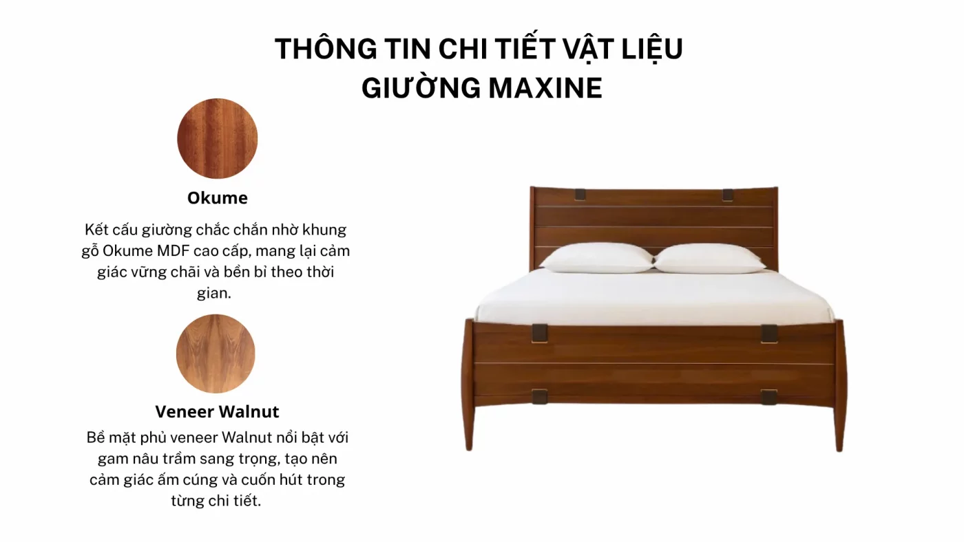 Giường ngủ gỗ Maxine 1m6 với đường nét thiết kế đến điểm nhấn đều hài hòa và đều rất giá trị. Sản phẩm sử dụng khung gỗ hoàn thiện mdf veneer và kim loại đồng làm chân và điểm nhấn. Giường Maxine giúp cho không gian phòng ngủ trở nên độc đáo, đậm chất thư giãn và sang trọng. Giường Maxine có 2 kích thước 1m6 và 1m8.