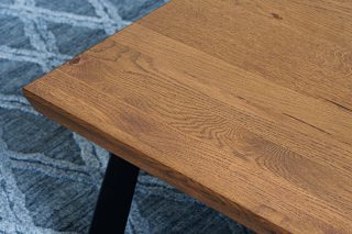 Jazz dining table is assembled from natural old oak slats. The characteristic surface with skillfully treated natural wood cracks, combined with strong powder-coated iron legs, will bring a unique personality to the homeowner.