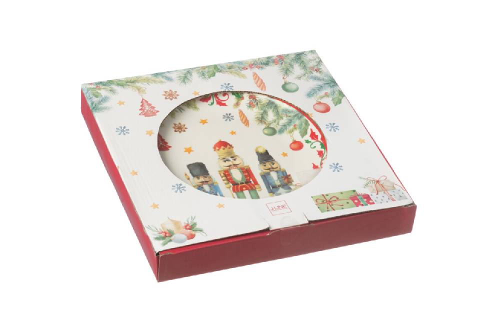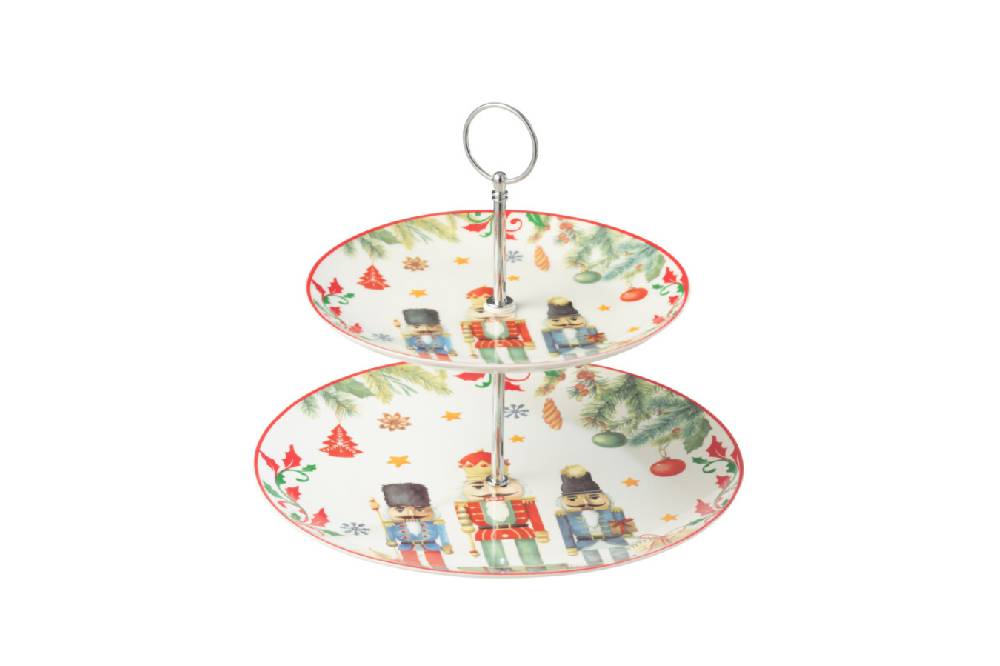 Khay đựng bánh này có thiết kế hình tròn với hai tầng, phù hợp cho việc bày biện đồ ăn. Mặt trên và mặt dưới đều được trang trí bằng hình ảnh các nhân vật múa rối (như lính chì) và họa tiết Giáng Sinh như cây thông, ngôi sao và các món quà nhỏ. Viền khay có màu đỏ, tạo điểm nhấn nổi bật cho sản phẩm. Khay được kết nối bằng một tay cầm kim loại ở giữa. Đây là một món đồ trang trí tuyệt vời cho các buổi tiệc mừng Giáng Sinh hoặc các dịp lễ hội.
