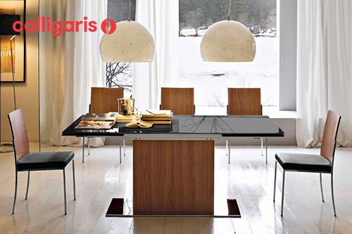 Park black glass extended dining table is imported from the famous Italian brand Calligaris with luxurious design for modern dining space. The legs have a cylindrical structure, the table top can be extended to 12 seats or retracted when needed, the perfect choice for your dining room interior.