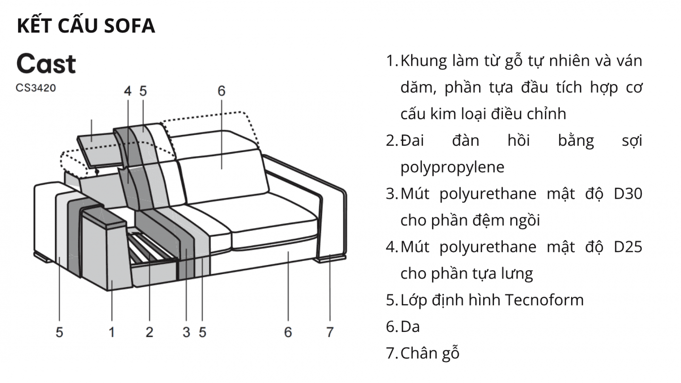 Sofa Cast gây ấn tượng với thiết kế hiện đại, đường nét tinh giản và phom dáng ôm trọn. Phần đệm ngồi có thể kéo ra linh hoạt, kết hợp với tay vịn đệm dày hơi nghiêng, mang lại cảm giác thư giãn tối đa. Các đường may nổi được xử lý tinh tế, tạo điểm nhấn thanh lịch và sắc sảo. Cast là lựa chọn lý tưởng cho không gian sống đề cao sự tiện nghi và thẩm mỹ.