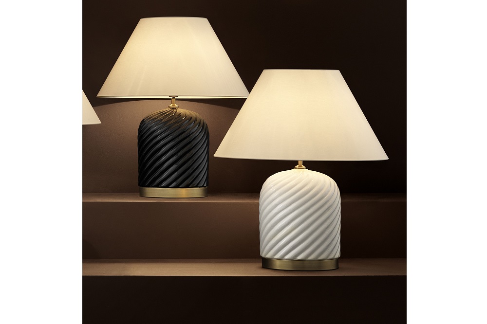 Add a touch of texture to your table tops with the sophisticated Savona Table Lamp, featuring a white ceramic lamp base with spirally relief. Its cosmopolitan look is played up by an antique brass finish lamp socket and base and a simple cream lampshade.