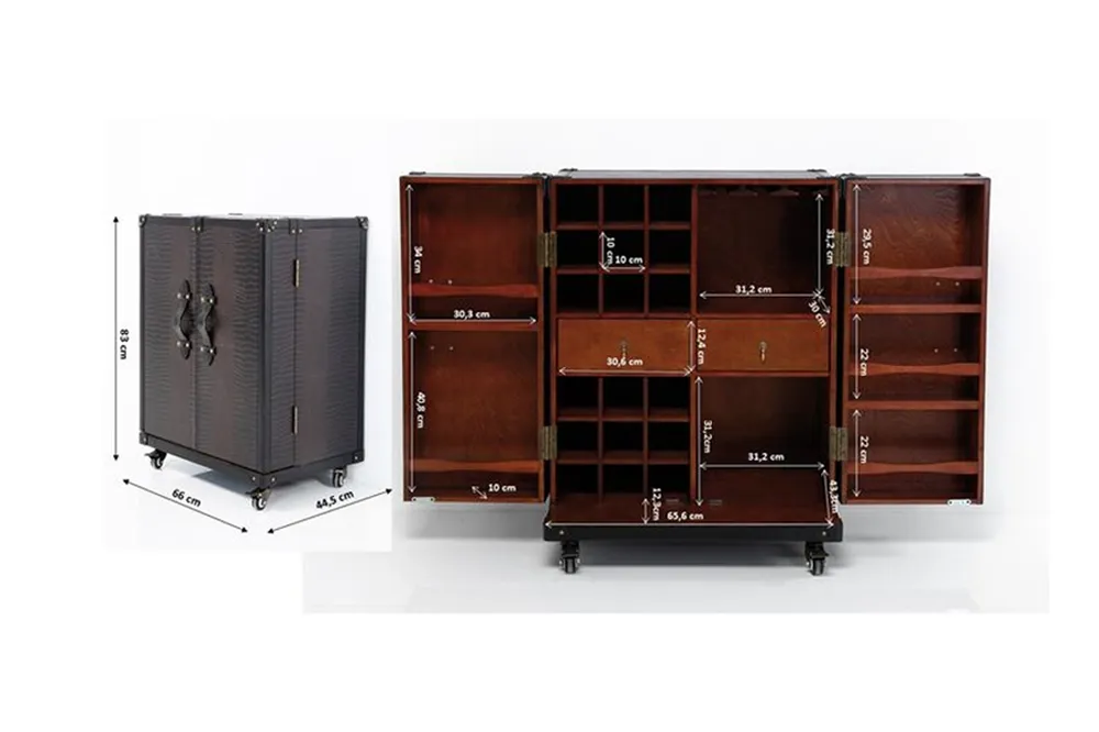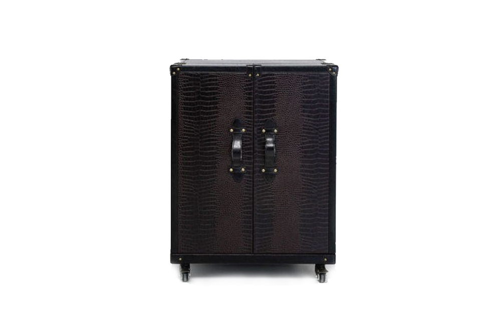 Tủ Rượu Globetrotter gợi cảm hứng từ chiếc rương du lịch vintage với bề mặt vân da và đinh tán kim loại tinh tế. Thiết kế dạng bar cabinet tiện dụng giúp sắp xếp ly, chai rượu, phụ kiện pha chế gọn gàng; bánh xe linh hoạt cho phép di chuyển dễ dàng giữa phòng khách và phòng ăn. Chất liệu MDF phủ hoàn thiện bền đẹp, phù hợp không gian Modern Classic hoặc Vintage.