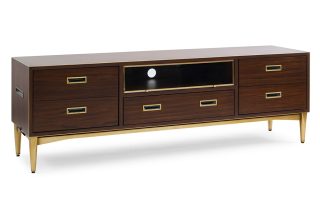 Tủ tivi Maxine thu hút ngay ánh nhìn đầu tiên bởi vẻ đẹp của màu gỗ nâu trầm bóng, với những nét hài hòa của hệ thống tay nắm được bo bằng chất liệu kim loại đồng sang trọng. Thiết kế sang trọng và hiện đại nhưng vẫn không quên công năng đầy đủ của ngăn kéo. Kết cấu vững chắc bởi hệ thống chân bằng đồng thon gọn. Tủ tivi Maxine là lựa chọn sang trọng cho phòng khách của bạn.