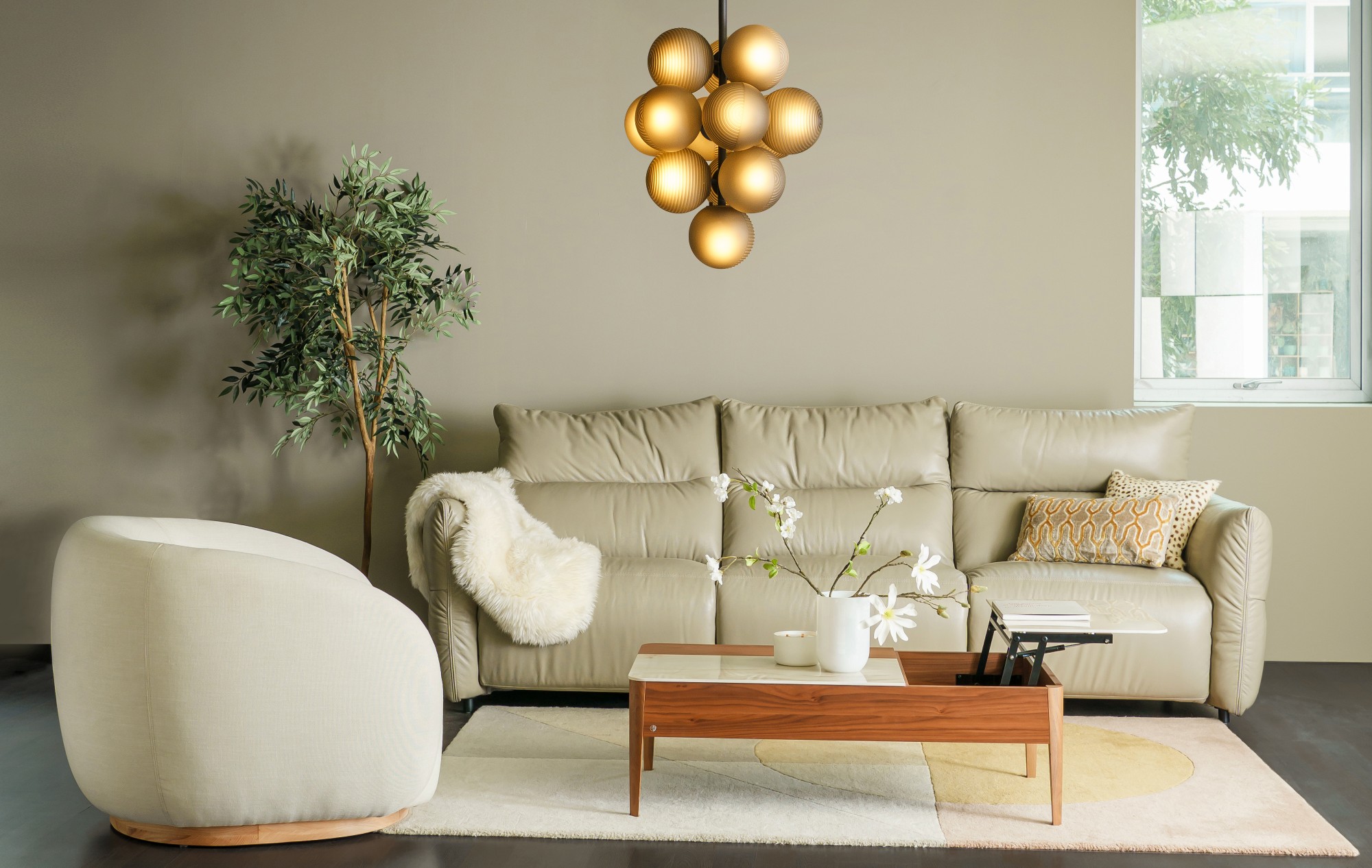 Sofa Motion Mars là sự kết hợp hoàn hảo giữa phong cách modern minimalist và ảnh hưởng từ thiết kế Scandinavian. Những đường nét thẳng, màu sắc trung tính như light coffee cùng với sự ấm áp từ chất liệu da và gỗ sẽ mang lại cảm giác thư giãn tối đa. Điểm nhấn xanh từ cây cảnh hay ánh sáng tự nhiên từ cửa sổ lớn sẽ làm cho không gian phòng khách thêm phần sống động và hài hòa.
